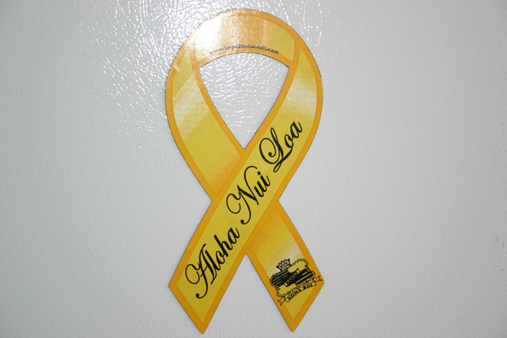 黄色のリボンにつきまして、説明しますね。 いやー予想以上に反響がありびっくりしています。 まず大きさですが上から下で21CMです。 購入方法はこのサイトからのメールか 電話で042−563−3436にお問い合わせ下さい。銀行振り込みのみでりそな銀行になります。 一枚ですと代金1050円(消費税込)と送料80円 計1130円と振り込み手数料になります。 二枚から送料はこちらで負担させていただきます。 またお店からお問い合わせがございましたが30枚からは卸値で販売させていただきます。 今後は取り扱い店舗で販売していただこうと思っていますが今のところご迷惑をお掛けしますが 郵送だけでやっております。 さてハワイでは高級車などにも貼られていて 何かいい感じです。ほんわりするというか、黄色が どの色にもマッチするとは以外です。 日本で僕のリボンが目につけばうれしいですね。 MAHALO NUI LOA!