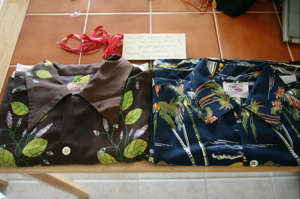 この前のヴィンテージアロハはニューヨークからきたと書きました。これは女性がオーナーだったのでしょう。ラッピングも素敵でした。シャツのコンディションも近年にないくらい良く、美しいというのが素直な感想です。今ハワイのアロハ事情も変わりつつあります。あえて名前は伏せますが、もう30年から50年以上営業をしている有名なアロハの会社が、立て続けに生産を中国に切り替えています。3−4社。一体全体どうなってしまったのでしょうか?もちろんコストを下げるのはわかりますが、伝統工芸みたいなものですから、凄く寂しく感じます。友禅を中国で生産するみたいなものです。僕だけは日本のプリントを使いハワイで生産し続けていきたいと思っています。このアロハの中国生産に関してご意見があればお寄せ下さい。Mahalo!