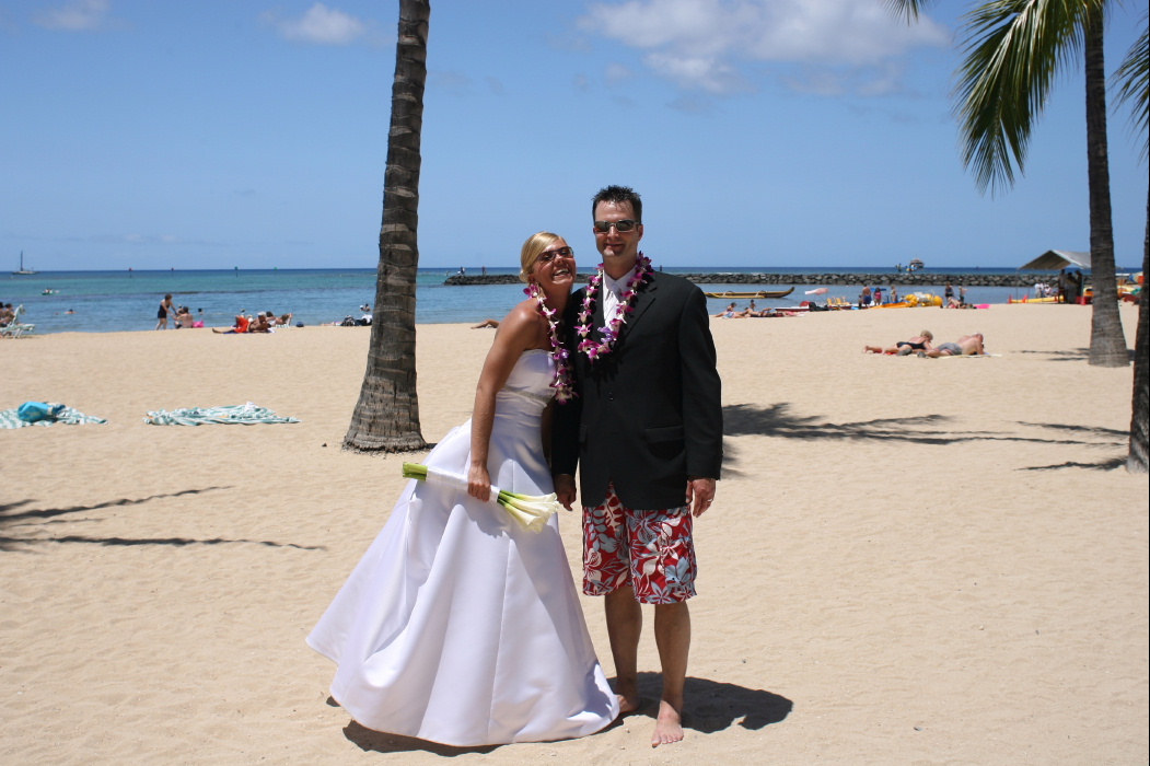 前にワイキキビーチを歩いていたら素敵な結婚式を見かけた。新郎がスイミングトランクスだった。とにかく底ぬけに明るいカップルで、実にハワイらしい光景であった。最近日本のニュースを読むと結婚率が少しUPしたそうだ。ハワイの挙式も多くなっていくと思う。しかしいつも僕が持っている懸念だが、日本からやってくる新郎新婦のお父さんの服装だ。最近は随分捌けたお父さんが増えてアロハを着用する方もいるが、まだまだ「礼服」をお持ちになる方も多い。写真の彼まで砕ける必要はないが青い空と青い海、夜逃げや本舗ばり、黒の礼服は場違いなことだけはお伝えしておく。