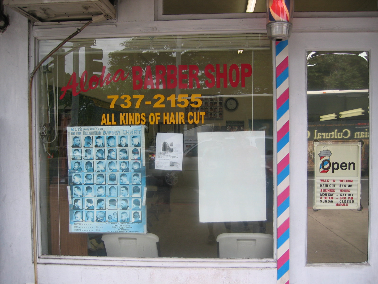 アメリカの床屋やというかカットは本当にひどい。左右非対称は当たり前。当初アメリカ人の美的感覚を疑った。しかしそれだけに留まらず、中国系も日系の床屋もひどかった。もちろん全米チェーンの「スーパーカット」は言うにおよばず。最近ベーリーズの少し山側にアロハ床屋を発見。実にうまくやってくれることを発見した。経営は韓国人で丁寧。いつも同じカットにしてくれる。値段は10ドル。チップを入れて12ドル。按摩器も購入しサービスも良い。髪が伸びたな〜〜と思っている方だまされたと思って行ってみてほしい。しかし完全保障はできないが・・・・・・・。