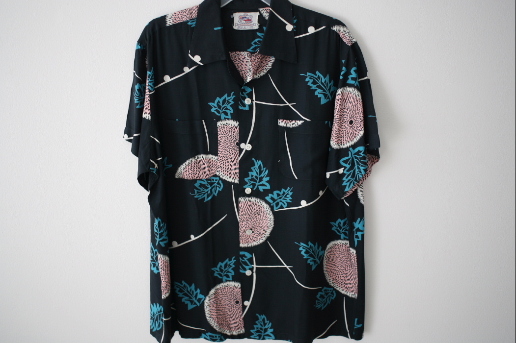 今週から最近手に入れたヴィンテージアロハを紹介する。これは僕が主に集めている「DUKE KAHANAMOKU」の物だ。黒をベースに和の雰囲気をうまく作っている。デュークのアロハは以外に黒ベースが少ない。これはデザイナーの趣味によるものか?また和柄が極端に少ないブランドであった。大柄で抜染が最高にかっこ良く実におしゃれなシャツだ。