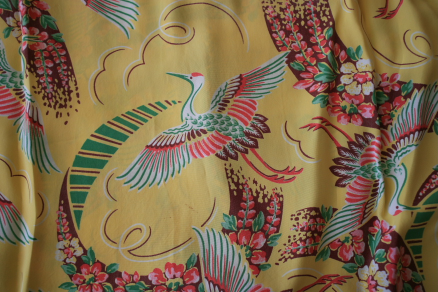 鶴はアロハの中ではオーソドックスなモチーフだ。もちろんアメリカ、ハワイには生息しない。今はモンゴル、ロシア、韓国、中国、日本に生息しているようだ。しかし日本では大昔から着物の柄として使われていた。さて今回のこの写真も鶴がモチーフ。このシャツを手に入れてまず思ったことは、外国人が描くイメージと東洋人が描く鶴のイメージは大きく異なることである。これはシャツに限ったことでではなく、映画などに見られる日本の表現の仕方もひどいものが多々ある。たぶん外国人、特にアメリカ人やイギリス人は中国も日本も同じに見えるのであろう。松田優作主演の映画「ブラックレイン」なども大阪の街は香港に見えた。このキヒキヒのヴィンテージのアロハは一生懸命東洋を表現しようと頑張っていた姿が想像できる。ハワイはアメリカ本土と日本の中間地点、和洋折衷まあ良いではないか・・・・。
