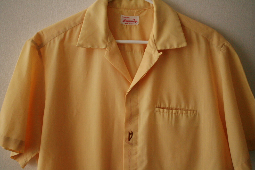 いつものようにヴィンテージ市場をお伝えしよう。この写真はボタンが隠れている、非常に珍しい1950年代製のレーヨン素材のものである。メーカーは「HAWAIIAN TOGS」。このように珍しい柄や、ベストコンディションのものは、市場ではどんどん高騰を続けている。特にアメリカ本土のバイヤーなどが、買い集めている。日本はこれから当然冬になるので、オークションなどは少し安くなるが、アメリカは、日に日に値段が吊り上がっている。先日もオークションで、1950年代製の「カメハメハ」が、3600ドルで落札されていた。ホノルルのベーリーズのオーナーが、「その金額で誰に売るのか?とっても理解に苦しむ」と言っていた。いつも書くが、とっくに消滅してしまっているメーカー、また作っていないものを手に入れるのは、年々困難になるのは間違いない。