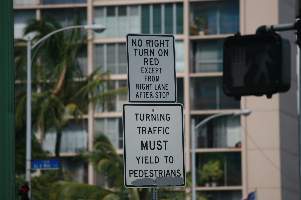 懐かしい漢字を使ってしまった。本当に最近「字」を書かなくなった。自分の名前さえ、ハワイにいる時は全て英語。漢字でものを書くということが、ほとんどない。話が逸れた。今日はハワイで、運転する時の注意点を教えよう。アメリカは場所によってハワイもそうであるが、赤信号の交差点では、しっかり止まり安全確認後に右折して良い。みなさんも赤信号無視しているな〜〜なんて、気がついた方もいると思う。次に信号がなく、4方向全て「STOP」サインがある交差点は、一番最初に入った車が、一番最初に出れる。これを知らない日本の人は前の車に続いてどんどん行ってしまうが、これは「大顰蹙」である。最後に良く捕まる交差点がある。赤信号でも右折可能と先に書いた。しかしたまに赤信号でも右折はだめという交差点がある。写真は「アラワイ」と「マッカリー」に入る交差点であるが、良く捕まっている。意味は2車線あるが、赤の場合右車線は確認後行っても良いが、その隣の車線は「だめよ」というもの。実に紛らわしい。これは完全に「ひっかけ」である。気をつけていただきたい。また安全運転を期待する。