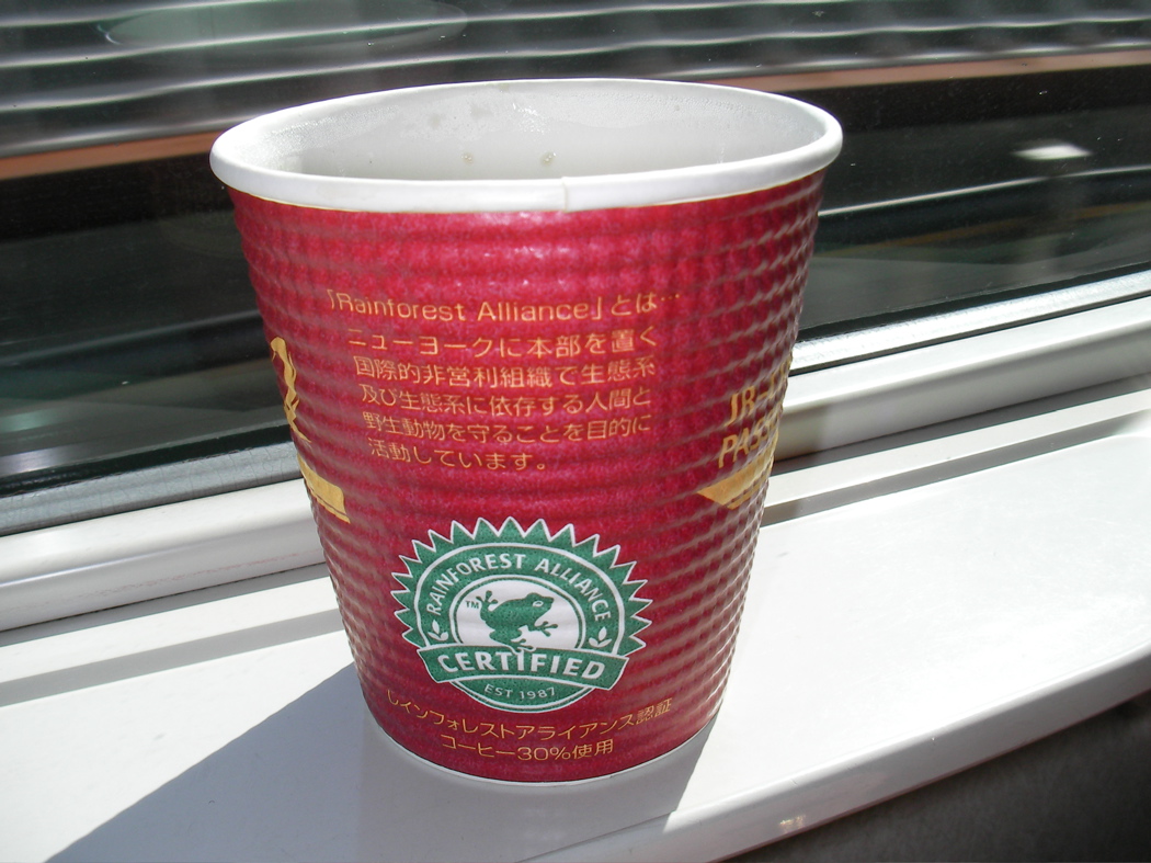 今仕事で日本にいる。日本は僕が17年前にいた頃より、数段コーヒーが旨くなっている。ワールドワイドに情報が広がり、それをキャッチしたというところだろうが、コーヒー好きな人にとっては有難いことである。そして最近気にいっているコーヒーのうちのひとつ「山陽新幹線」で販売している「レインフォーレストアライアンス」のコーヒーだ。これはかなりいける。スタバよりはるかに気にいっている。天然ぽいところがいい。食品の改ざんや怪しいものが多い中、堂々とニューヨークをうたい文句にしているところも何か興味を引く。機会があればぜひ飲んで欲しい。ちなみに300円である(笑)。
