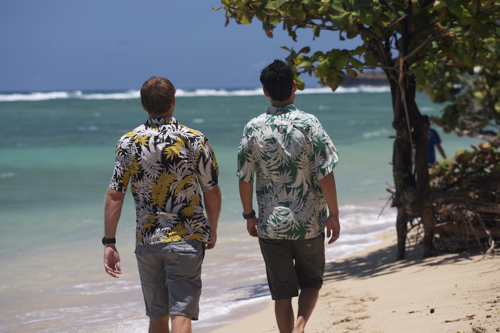 先月、僕の大好きなホノルルのINGカフェで、感じの良い店員と出会った。英語で最初は話していたが、日本語もぺらぺらであった。彼はハワイ大学を出て、今はINGで金融を勉強している。雰囲気が気に入ったので、事情を説明し、新作のアロハシャツのモデルを頼んだ。当日カハラのビーチで撮影したのがこれ。友人も連れてきて、ハワイらしいショットとなった。皆さんもこんな風に着てもらいたい。