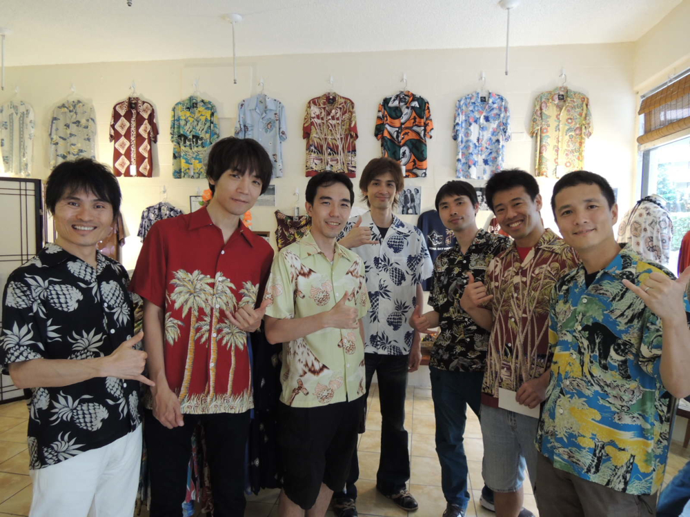 リピーター。この一言だけで、簡単に片付けしまってはいけない。ここは数千キロ離れたハワイである。先月寄って行ってくれたお客様が、たくさんの友人、知人を連れ再訪してくれた。3月には「大勢連れてきますよ」と、云い残して帰国した方。その言葉どうり写真のように、華やかに友達を案内してくれた。毎日の生業で一番重要なのは、再訪してもらうというだと、店を開けた日から良くわかった。卸の方ももちろん続けているが、こちらも毎年続けていただけれるところが増えてきた。通常はゴールデンウィークから販売開始の新宿伊勢丹メンズ館も、今年は何と3月10日から開始。驚きである。そして顧客の方々のこのアロハ着用の出で立ち良いではないか。「また来るよ!」それが最高に嬉しい。次回はコーヒー飲んでいって下さい。