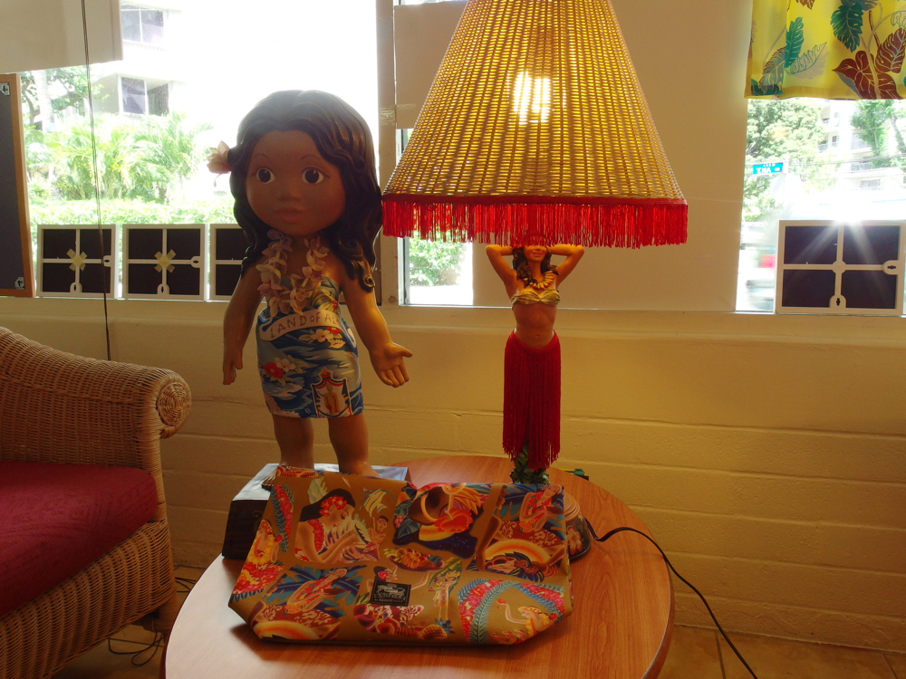 アンティークランプ復刻意外に、反響が大きかった。値段のせいもあるだろう。しかし忠実な復刻版なので、何か惹きつけるものがある。ちなみに本体は、中国製。少し説明を加える。大きさは台から、傘の上までで、82CM。かなり大型である。本体は何とか日本やヨーロッパに送ることが出来ても、傘も梱包となると、もちろん商品より郵送代の方が高くなる。こればかりは致し方ないので、来店していただき持って帰れるお客様ということになる。次にメネフネの女の子版も、新たに入荷した。世界に700体しかない、希少なオリジナル。こちらの大きさは、68CM。こちらもかなり大型。これは買って行く方も多いが、来店されて自分の飛行機の別送品扱いで送る手筈となる。店からヤマトを使い、梱包込家迄で約230ドルの送料。最後に肩掛けバッグは、既に売り切れが続出。写真ではご理解いただけなかったようで、日本で防水を施しているしっかりとした、ポリエステル製で頑丈である。云ってみれば、全然ちゃちくない。一際目を引くデザインと、しっかりとした作りのものである。こちらも基本は、ハワイストアでの販売と今はなっている。今後は検討中。
