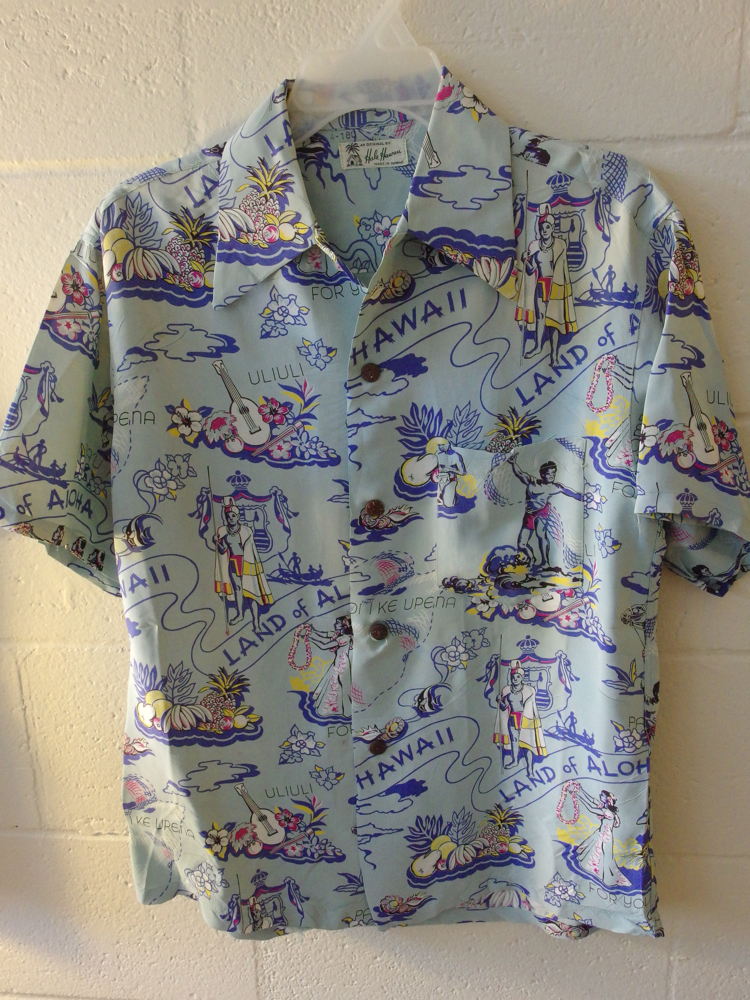 ここのところ、ヴィンテージアロハを購入する機会が激減している。もちろん値段の高騰によるものも大きいが、自分の持っているシャツが、収納仕切れないのも要因である。しかし昔のヴィンテージアロハから、色のイメージが浮かぶことも多いので、気になったものは稀に手に入れる。先週手に入れたのが、このランドオブアロハ。王道中の王道である。おそらくオリジナルの配色は、10別配色くらいあった気がする。ベイリーズでは黒が圧倒的に売れているが、この柄自体オーラがあるせいか、他の配色でも良く出る。全く同じ色では、基本的に復刻しないが、ベイリーズの強い要請により、黒は作り続ける。と、なると常に別配色を考えなければならぬ。で、参考に今回も購入した次第である。が、これがこのまま使われるということではない。思考に思考を重ね、オーダーする。でもこのランドオブアロハは、雰囲気あるなぁ〜。