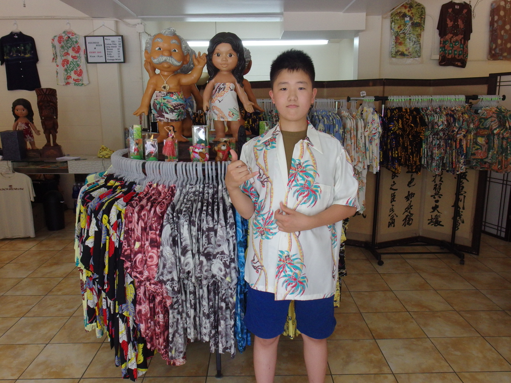 この家業を始めてだいぶなるが、日々色々な発見がある。日々お客様も違うのだから、当然ではあるが。8月はいつも僕のお店だけに関しては、お客様の数が少ない。ハワイにおみえになっている数は、今連日6000人を超える。毎年そうであるが、8月はリピーターの方に、支えられている。1年に1度、同じ時期にきっちり来られる、お客様がいるのである。さて本題に戻そう。僕の店はワイキキの中心から、ちと外れている。DFS辺りからだと、歩いて17分くらいか。往復約40分かけて、来ていただいている。感謝しても、足りないくらいである。で、色々な方がやってくる訳であるが、この写真の少年。中学1年生。本物のアロハシャツが欲しいと、自分で調べお母さんに連れて来てもらったそうである。しかも自分のお小遣いで、買っていった。思わず抱きしめたくなる、可愛い少年であった。何年か後に自分のお金で、ハワイに来れるといいな〜と、お母さんと少年の後ろ姿を見て思った。大志を抱け!