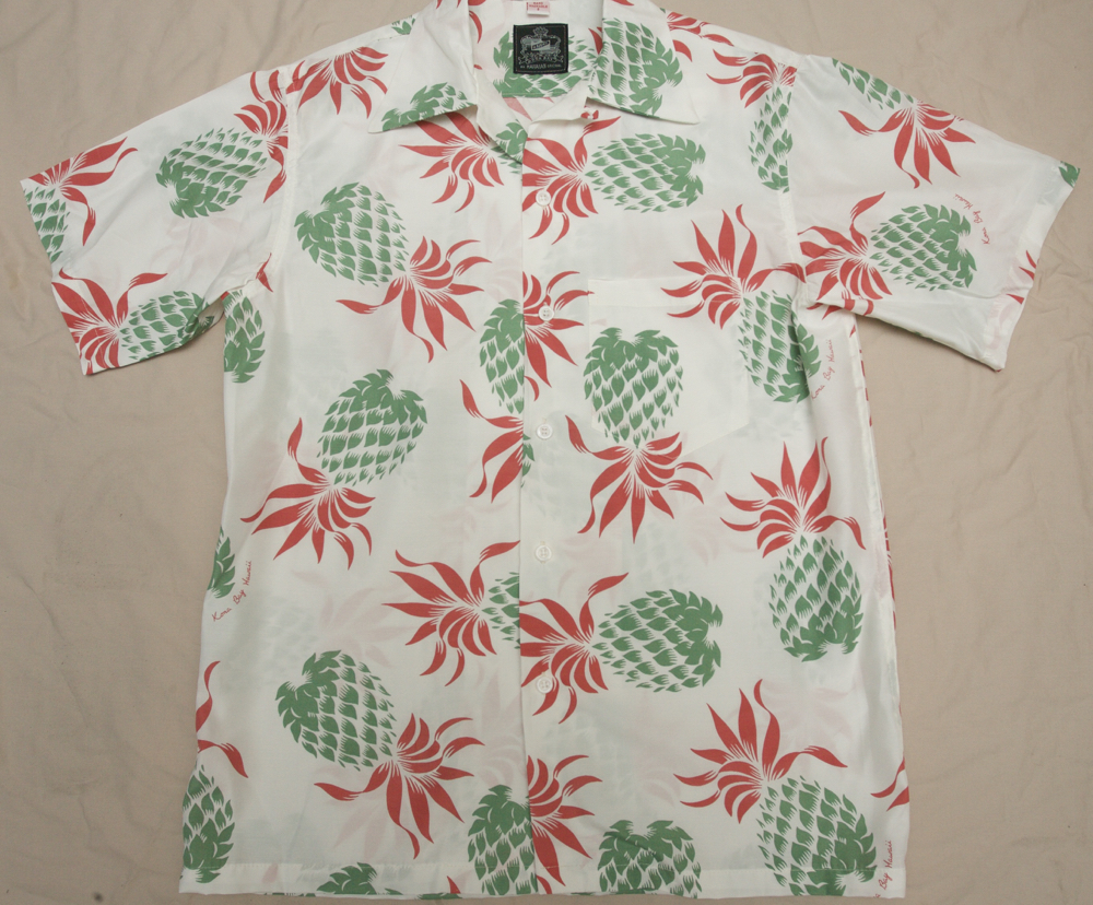 ハワイ州観光局公認のプロジェクト「111-HAWAII PROJECT」と「KONA BAY」が 共同開発した商品として「デュークス・パイナップル」が発売されたようですね。 定番色の「ネイビー」と「ホワイト」の二色のようですが スーパー・マーケットや、土産物屋で販売されている「中国製」「韓国製」の 「南国風絵柄シャツ」を「アロハシャツ」だと思って着ている人達に 「本物」のアロハシャツとして認識される事を祈っております。 (アクリル・ケースに入って販売されているアロハシャツは初めて見ましたが・笑)