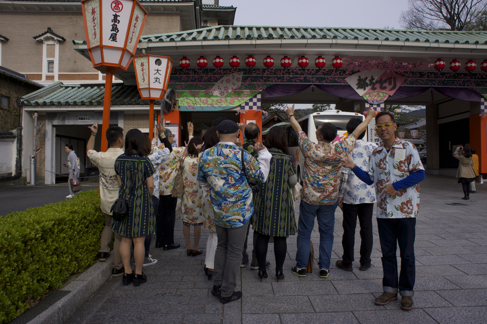 あららららららら。僕は突然、京都花見小路祇園甲部に現れた。その前にちょいと、時間を戻す。先週東京にやってきた。東京の僕の部屋は、普段使わない為、ガスがつかずお湯が出ないという不幸に見舞われた。翌朝京都に行かなくてらならぬが、お湯が出ない。お湯が出ないと、まだまだ寒い東京で、水のシャワーはちと厳しい。「うううー」とか「あーあー」とか、言葉にならぬうめき声を、一人ではいた。レヴェナント、 蘇えりし者をホノルル発の飛行機で見た為、まるでデュカプリオのように朝冷たい水を浴び、まるで映画がじゃねーかとため息をついた。そして京都に降り立った僕は、花見小路の祇園甲部に見ることが出来る。都をどり鑑賞の際、贔屓筋の旦那が、酔狂で全員アロハシャツで揃えた。左袖に刺繍を施した。半年間の構想で、特注である。我が物顔で、このあと皆さんを案内したのは云うまでもない。LAでユニバーサル・スタジオに、昔お客様をお連れした時が、急に脳裏をよぎる。そして夜は恒例のお座敷。酔狂で度々読んでいただける旦那には、いつも頭が下がるのである。京都文化を守る予定が何故か全員アロハシャツ。このアンバランスが何ともいいのである。