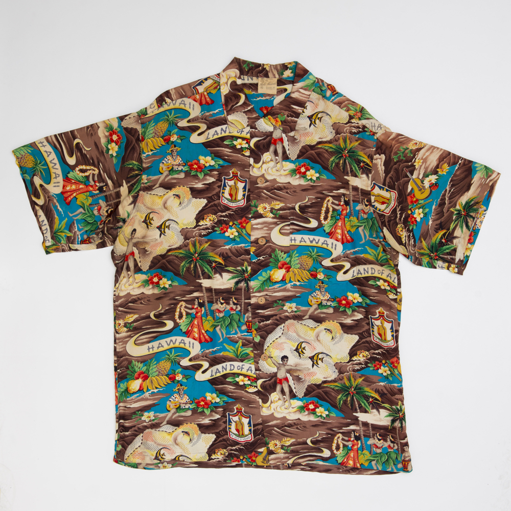 ここのところ、オリジナルのヴィンテージが、ちょぼちょぼ売れ始めている。「どうせ買うならとオリジナルを」と云って来て下さる。嬉しいことである。今日紹介するヴィンテージは、本当にもう2度と出てこない、デザイン、コンディション、有名柄である。おそらく1度も洗濯していない、1950年代初頭のデッドストック。このランドオブアロハは、21色も使っている。22スクリーン。驚きの数である。これを購入していかれた方は、人品の良い、まこと雰囲気の良い男性であった。価格?云わぬが花であろう。